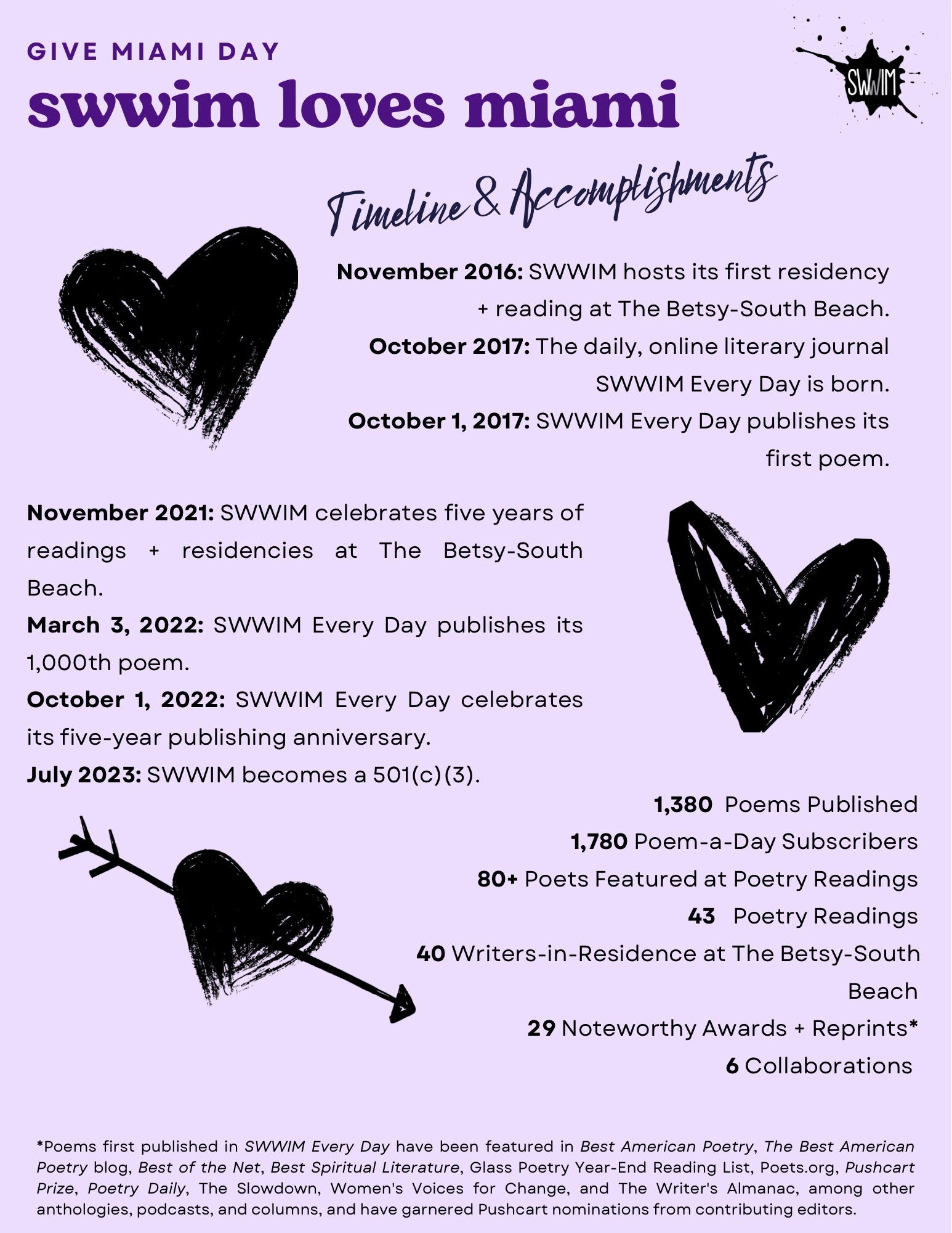 You are the ones who SWWIM with us, every day, and we could not be more appreciative of your support. This year, for the first time, SWWIM is participating in Give Miami Day, one of the largest annual giving events in the nation. SWWIM is run by an all-volunteer staff; every dollar we receive goes right back into the organization. If your situation allows, we would be extremely thankful if you'd consider donating to help fund our programming. (To that end, see what we’ve accomplished so far in the graphic below.)